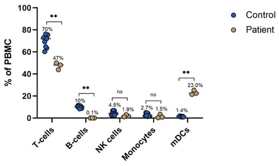 Frequencies of major immune subsets. Significance levels analysed by the Mann–Whitney test: ns = p > 0.1, ** = p ≤ 0.01. Gray lines indicate mean values. PBMC: peripheral blood mononuclear cells.
