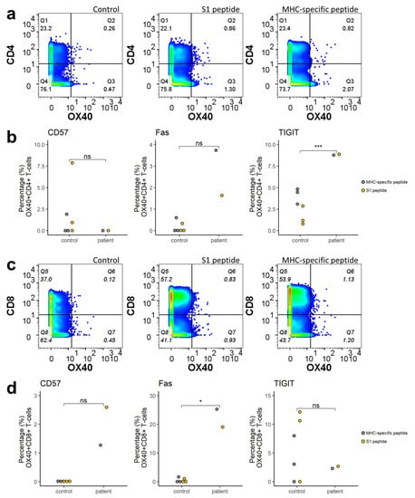 (a,c) CD4+ and CD8+ T-cells from the patient displayed upregulation in OX40 expression when stimulated with S1 and MHC-specific peptides compared to unstimulated cells. (b,d) Expressions of functional markers in antigen-specific OX40+CD4+ and OX40+CD8+ T-cells. Significance levels analysed by the Mann–Whitney test: ns (not significant) = p > 0.1, * = p ≤ 0.1, *** = p ≤ 0.001. MHC: major histocompatibility complex.