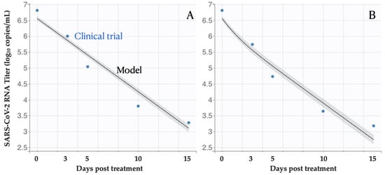 Viral load following Molnupiravir treatment. The estimated means and 95% CI of virus titer from the fitted within-host model track the mean values of empirical observations (blue circles) among patients treated with (A) placebo, or (B) Molnupiravir. Day zero corresponds to the beginning of the treatment.