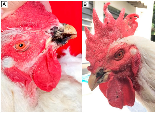 Gross pathology of affected roosters. (A) Major lesions consisted mainly of necrosis in nostrils and beaks. (B) Regular lesions in some birds included scabs and crusts in the combs and wattles.