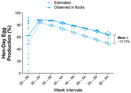 Percentages of hen-day egg production (HDEP) for estimated and observed flocks. Results are presented as mean and standard deviation, and mean differences (shown as delta “Δ” mean) were calculated subtracting observed from estimated values. Comparisons were performed using the two-way ANOVA test followed by the Bonferroni correction post-hoc test.