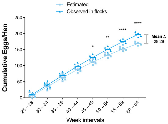 Cumulative egg/hen production (CEHP) for estimated and observed flocks. Results are presented as mean and standard deviation, and mean differences (shown as delta “Δ” mean) were calculated subtracting observed from estimated values. Comparisons were performed using the two-way ANOVA test followed by the Bonferroni correction post-hoc test. * p < 0.05; ** p < 0.005; *** p < 0.0005; **** p < 0.0001.