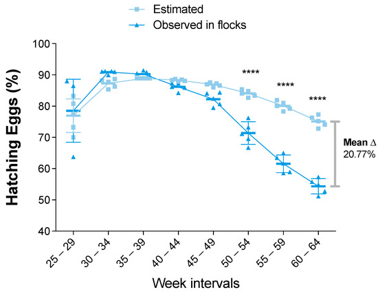 Up until this point, the data from the observed farms were equal to or better than the estimated data. However, a different pattern was observed in the hatching eggs (HE) comparison. As in the case of the previous indicators, the observed data were equal to or greater than the estimated data in the initial intervals. However, the HE percentage decreased starting in the 40–44-week interval (Figure 4). Furthermore, the difference between the estimated and observed data became statistically significant (p value < 0.0001) from the 50–54-week interval to the end of the productive period. Thus, the HE mean difference was unfavorable to the observed data, with 20.77% fewer hatched eggs than estimated (Figure 4).