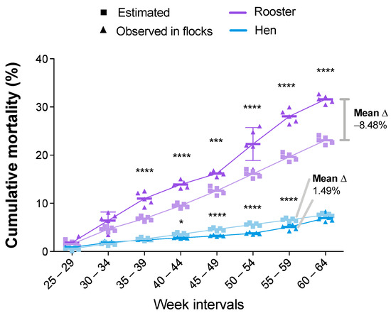 Percentages of cumulative rooster mortality (CRM) and cumulative hen mortality (CHM) for estimated and observed flocks. Results are presented as mean and standard deviation, and mean differences (shown as delta “Δ” mean) were calculated subtracting observed from estimated values. Comparisons were performed using the two-way ANOVA test followed by the Bonferroni correction post-hoc test. * p < 0.05; ** p < 0.005; *** p < 0.0005; **** p < 0.0001.