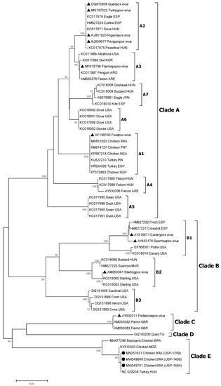 The representative species of the genus, FWPW, is found in the subclade A1. Species PGPV, PNGPV, and TKPV, as well as species FLMPV, are contained in subclades A2 and A3, respectively, while CNPV and SLPV are correspondingly contained in subclades B1 and B2. Clade C contains the PSPV [13,14,15]. Clade D was proposed by an isolated study in Japanese quail [16]. The latest member, clade E avipoxvirus, was first reported in turkeys in Hungary [17], then in breeder chickens in Mozambique [18], and recently in backyard chickens in South Brazil [19].