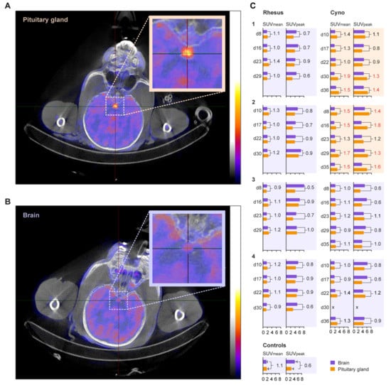 - Goutal, S.; Tournier, N.; Guillermier, M.; Van Camp, N.; Barret, O.; Gaudin, M.; Bottlaender, M.; Hantraye, P.; Lavisse, S. Comparative test-retest variability of outcome parameters derived from brain [18F]FDG PET studies in non-human primates. PLoS ONE 2020, 15, e0240228. [Google Scholar] [CrossRef]