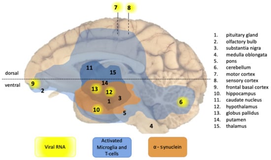 - Tulisiak, C.T.; Mercado, G.; Peelaerts, W.; Brundin, L.; Brundin, P. Can infections trigger alpha-synucleinopathies? Prog. Mol. Biol. Transl. Sci. 2019, 168, 299–322. [Google Scholar] [CrossRef]