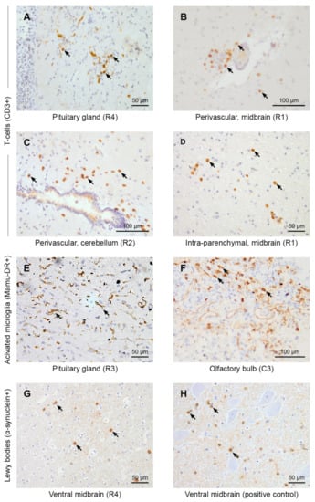 Philippens, I.H.C.H.M.; Böszörményi, K.P.; Wubben, J.A.M.; Fagrouch, Z.C.; van Driel, N.; Mayenburg, A.Q.; Lozovagia, D.; Roos, E.; Schurink, B.; Bugiani, M.; et al. Brain Inflammation and Intracellular α-Synuclein Aggregates in Macaques after SARS-CoV-2 Infection. Viruses 2022, 14, 776. https://doi.org/10.3390/v14040776