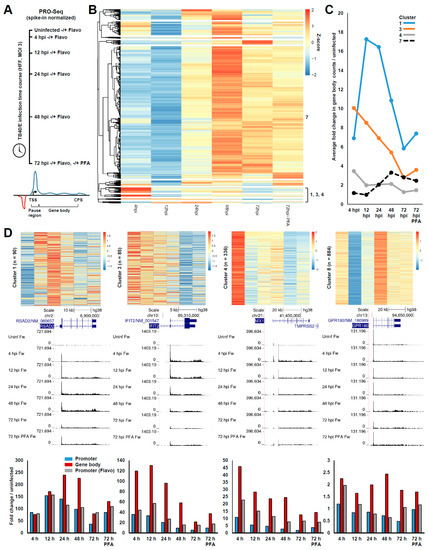 Effects of HCMV infection on Pol II transcription. (A) Schematic depicting experimental design. Spike-in quantitative PRO-Seq was performed with samples derived from contact-inhibited HFFs that were mock-infected or infected for 4, 12, 24, 48, or 72 h. For all time points, an additional sample in which the cells were treated with Flavo for the final hour of infection to block Pol II pause-release was collected. For the 72 h time point, the effect of blocking HCMV replication by treatment with PFA from the onset of infection was also tested −/+ Flavo during the final hour of infection. At the bottom, a diagram depicting the pause and gene body regions quantified for analysis is shown; (B) Heatmap displaying hierarchical clustering of ratios in PRO-Seq gene body counts, which were computed for each gene at each time point over the uninfected control and are represented as Z-scores, which were computed for each gene. Certain clusters are identified at the right of the heatmap; (C) plot of average fold change in gene body counts for all genes within clusters 1, 3, 4, and 7 along the infection time course; (D) top: blown up views of heatmaps representing genes in clusters 1, 3, 4, and 8. Legends represent the Z-score. Middle: UCSC Genome Browser snapshots showing forward strand (Fw) PRO-Seq data from DMSO-treated samples, for example, genes representing the above clusters. Bottom: graphs displaying fold changes in pause region and gene body counts from DMSO-treated samples and fold change in pause region counts from Flavo-treated samples along the infection time course for the above genes.
