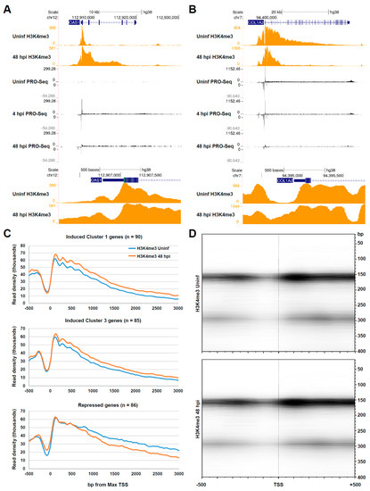 The sum of H3K4me3 read densities across genomic intervals between −500 and +3000 bp from the MaxTSS of all genes in clusters 1, 3, and the repressed set were generated using bedtools coverage program. Read densities were plotted using MS Excel. FragMaps were generated from the HFF uninfected and 48 hpi H3K4me3 fragments of size between 18 bp and 400 bp that were present in the genomic intervals between −/+500 bp from the MaxTSSs of genes in the repressed set using the fragMap program (available online: https://github.com/P-TEFb/fragMap (accessed on 13 August 2021)).