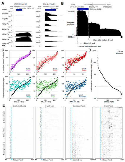 HCMV infection dramatically impacted Pol III transcription of tRNAs. (A) Genome browser snapshots of forward-strand (Fw) PRO-Seq data at tRNA genes that were significantly induced along the course of infection (left) repressed along the course of infection (right); (B) genome browser snapshot of forward-strand PRO-Seq data of the tRNA-Leu-CAG-2-1 gene at 48 hpi. Sites where read coverage was quantified for analysis are indicated. Matches to the motif TTTT on the nontemplate strand detected with the UCSC genome browser short match function are indicated; (C) plots of read coverage at the 5′ upstream position in uninfected HFFs and HFFs infected for 4, 12, 24, 48, or 72 h, and 72 h + PFA. In each plot, the read coverage for each tRNA in the uninfected HFFs is displayed with the data for the infection time point, and the data are sorted by lowest to highest read coverage in uninfected cells. Data are plotted on a log10 scale; (D) Graphs depicting the fold-change in read coverage at the 5′ upstream position (48 hpi/uninfected) for all 235 analyzed tRNA genes, sorted from most induced to most repressed. Fold change was plotted on a log10 scale; (E) heatmaps of PRO-Seq 5′ ends and 3′ ends at tRNA genes in uninfected HFFs and HFFs infected for 48 h. Data are displayed for a region spanning −50 to +200 relative to the mature 5′ end and are sorted from top to bottom by most induced at 48 h to most repressed according to the ratio of read coverage at the 5′ upstream position.