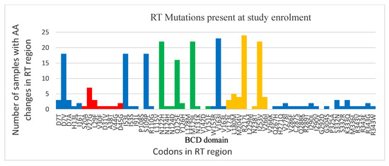 Red-shaded bars show mutations in the G and F domains of the reverse transcriptase (RT) region, yellow bars show mutations in the B, C and D domain of RT, which contain catalytic sites, whilst the green bars show the area where changes in pol result in s-gene mutations in overlapping frame