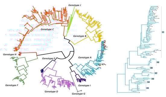 Maximum likelihood phylogenetic tree showing ten HBV genotype references and an expansion of genotype A with study sequences represented by red dots. Booster support values (>0.95) for major branches.