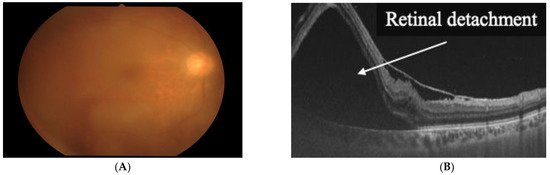 Horizontal transmission of HTLV-1 is responsible for HTLV-1 uveitis. (A) Vitreous opacity is seen in the right eye. (B) Severe and persistent ocular inflammation of horizontally transmitted HU resulted in retinal detachment (Reproduced with permission from Kamoi et al., Lancet Infect. Dis. 2021 [44]).