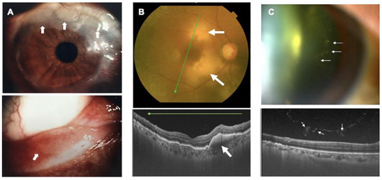 Ocular infiltration in ATL. Multiple knob-like ATL cell ocular infiltrates are seen (KAMOI sign). The KAMOI sign (A,B; white arrows) can be seen at the bulbar conjunctiva around the corneal limbus and at the palpebral conjunctiva around the lacrimal punctum (A) and in the retina (B). Multiple infiltrating ATL cells in the vitreous tend to form clusters (C) (Reproduced with permission from Kamoi et al., Cornea 2016 [62]; Kamoi. Front. Microbiol. 2020 [19]).