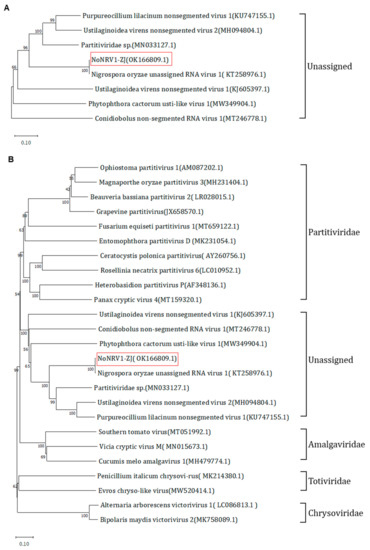 Phylogenetic analysis of NoNRV1-ZJ with other mycoviruses. (A) Phylogenetic tree of the ORF1-encoded protein from seven unassigned non-segmented dsRNA mycoviruses. (B) Phylogenetic tree of the RdRP protein encoded by five different groups of mycoviruses with dsRNA genomes. NoNRV1-ZJ (OK166809.1) identified in this work is highlighted by a red rectangle.