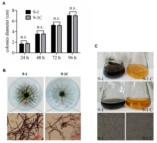 Infection with NoNRV1-ZJ promoted pigmentation of host cells. (A) Colonial sizes of 9-1 and 9-1C on PDA plates 4 days after inoculation. n.s. indicates no statistical difference at a certain time point. (B) Macroscopic and microscopic views of 9-1 and 9-1C on PDA plates at 7 days post inoculation. Upper panel: mycelium morphologies of 9-1 and 9-1C on PDA plates. Lower panel: microscopic observation of hyphae collected from both plates, as indicated by red rectangles. (C) Cultivation of 9-1 and 9-1C in liquid PDA media for 22 days. Top panel: liquid cultures; middle panel: filtered liquid from the liquid cultures; bottom panel: microscopic observation of the hyphae recovered from the liquid cultures.