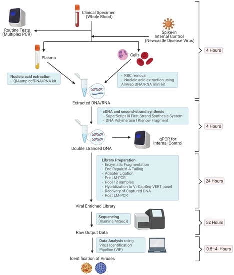 A schematic diagram of the virus detection procedure used in this study. Equipment and kits used, and the time consumed at each step are shown (Created with BioRender.com, accessed on 5 April 2022).