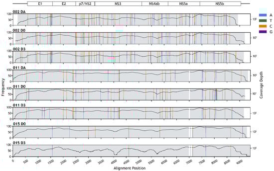 Polymorphic sites with aggregated minor allele frequencies of more than 20% and with at least 20× read-mapping depths were determined by mapping NGS reads back to the consensus sequences. The average number of polymorphic sites per kilobase for Patient 002, 011, and 015’s HPgV-1s was 9.27, 3.86, and 0.80, respectively (Figure 2, Tables S3 and S4). Of all the polymorphic sites identified, 94.86% were either C/T variant sites (56.76–67.44%) or A/G variant sites (27.91–40%).