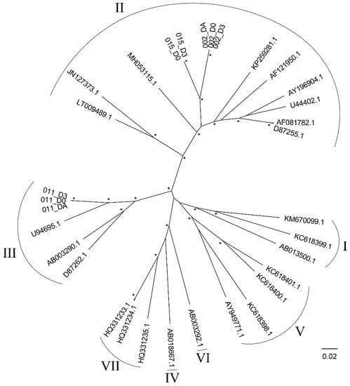 - Nguyen, L.-T.; Schmidt, H.A.; von Haeseler, A.; Minh, B.Q. IQ-TREE: A Fast and Effective Stochastic Algorithm for Estimating Maximum-Likelihood Phylogenies. Mol. Biol. Evol. 2014, 32, 268–274. [Google Scholar] [CrossRef] [PubMed]