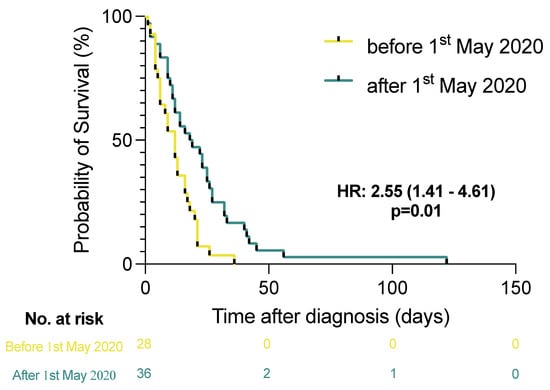 Following initial reports of a high prevalence of thrombotic events, local guidelines on anticoagulant therapy for hospitalized patients in the city of Hamburg were adjusted by May 2020 [6]. A statistically significant prolongation of survival time of critically ill COVID-19 patients was observed for cases between May and December 2021 compared to the period before, as confirmed by the log-rank test (HR: 2.55 [95% CI 1.41–4.61], p = 0.01) (see Figure 1). A change in clinical practice, associated with less frequent occurrence of VTE (54% vs. 25%; X2 = 5.49, p = 0.02) and PE (39% vs. 22%; X2 = 2.20, p = 0.14).