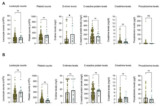 Relevant laboratory parameters of consecutive COVID-19 patients admitted to the Department of Intensive Care Medicine (University Medical Center Hamburg-Eppendorf, Germany) are illustrated (n = 170). Laboratory parameters at the time of admission (A) and peak parameters (B) are illustrated (only for platelet counts the minimum parameters are shown). Patients were grouped according to the presence of pulmonary embolisms (patients w/o pulmonary embolism are marked yellow on the left, and patients with pulmonary embolism are marked green on the right). Statistical comparisons between groups were performed using the Mann–Whitney U-test. p-values are displayed as follows: *, p < 0.05; ns, not significant.