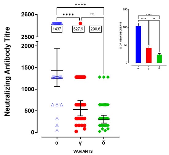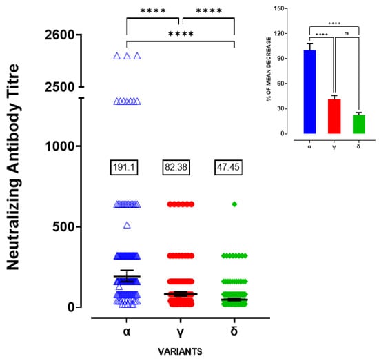 Neutralizing antibody titre against Alpha, Gamma and Delta variants **** p < 0.0001; Inset: Percentage (%) of mean decrease for neutralizing antibody titre against Gamma and Delta variants with respect to Alpha **** p < 0.0001; ns = not significant.