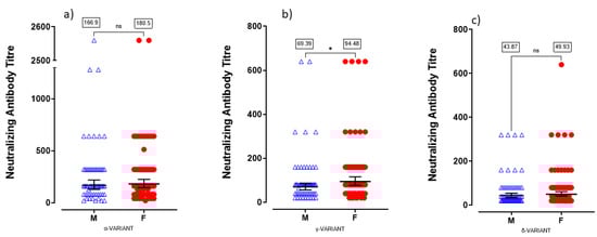 Gender effect on neutralizing antibody titre against variants of concern: (a) neutralizing antibody titre against Alpha variant in male and female subjects, ns = not significant; (b) neutralizing antibody titre against Gamma variant in male and female subjects, * p < 0.05; (c) neutralizing antibody titre against Delta variant in male and female subjects, ns = not significant.