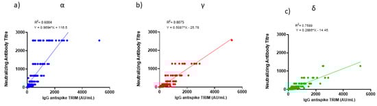 Correlation between neutralizing antibody titres against variants of interest and IgG anti-spike TRIM levels (a) correlation between neutralizing antibody titres against Alpha variants and IgG anti-spike TRIM levels; (b) correlation between neutralizing antibody titres against Gamma variants and IgG anti-spike TRIM levels; (c) correlation between neutralizing antibody titres against Delta variants and IgG anti-spike TRIM levels.