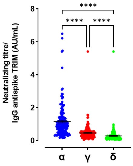 Ratio between neutralizing antibody titre against Alpha, Gamma and Delta variants and IgG anti-spike TRIM levels **** p < 0.0001.