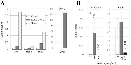 Susceptibility of 293T, HeLa, and TE671 cells to Ebola virus- or SARS-CoV-2-pseudotyped HIV-1 vector infection. (A) Human 293T, HeLa, and TE671 cells were inoculated with HIV-1 vector containing Ebola virus or SARS-CoV-2 envelope glycoprotein. The vector encodes the luciferase gene, and luciferase activities of the inoculated cells were measured. This experiment was repeated three times. Representative luminescence values are indicated. (B) Target 293T cells were inoculated with indicated pseudotyped HIV-1 vector in the presence of an antibody. Luminescences in inoculated cells were adjusted by the subtraction of those with HIV-1 vector without any viral envelope proteins. The subtracted values are indicated. This experiment was performed in triplicate. Error bars indicate SDs. When the differences compared to control cells are significant, the p values of Student’s t-test are indicated.
