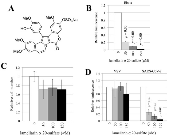 Lamellarin α 20-sulfate (Figure 2A) was synthesized as previously described [23]. To examine whether lamellarin α 20-sulfate inhibited Ebola virus-pseudotyped HIV-1 vector infection, target 293T cells were pretreated with lamellarin α 20-sulfate for 5 h and were then inoculated with the pseudotyped HIV-1 vector in the presence of lamellarin α 20-sulfate. Luciferase activity decreased with 150 µM of lamellarin α 20-sulfate (Figure 2B).