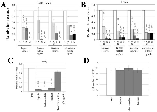 To analyze the impact of sulfated polysaccharides on Ebola virus-, SARS-CoV-2, or VSV-pseudotyped HIV-1 vector infection, 293T cells were pretreated with heparin, dextran sulfate, fucoidan, or chondroitin sulfate and were then inoculated with the pseudotyped HIV-1 vector in the presence of sulfated polysaccharides at the same concentration. The luciferase activities of the SARS-CoV-2-pseudotyped vector-inoculated cells were significantly decreased by all of the sulfated polysaccharides examined in a dose-dependent manner (Figure 4A). Similarly, the luciferase activities of the Ebola virus-pseudotyped vector-inoculated cells were reduced by all of the sulfated polysaccharides that were examined (Figure 4B).