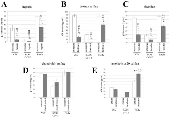 Heparin, dextran sulfate, and fucoidan reduced the levels of the p24 protein in the cells incubated with each pseudotyped HIV-1 vector, showing that these compounds inhibit the interaction of the pseudotyped vectors with 293T cells (Figure 5A–C). However, the p24 levels were not changed by lamellarin α 20-sulfate and chondroitin sulfate (Figure 5D,E), which did not inhibit VSV-pseudotyped HIV-1 vector infection. These results indicate that heparin, dextran sulfate, and fucoidan inhibit Ebola virus- or SARS-CoV-2-pseudotyped vector infections by suppressing the interaction of these vectors with target cells. Lamellarin α 20-sulfate and chondroitin sulfate also inhibited infections caused by the envelope glycoproteins of Ebola virus and SARS-CoV-2, but the mechanism underlying these inhibitions was unknown.