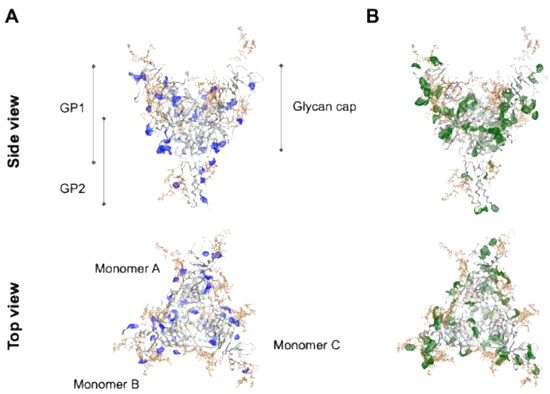 Characterization of chemical features of the Ebola virus glycoprotein surface for the molecular interactions. An Ebola virus GPΔ-Res structure at 100 ns of MD simulations was used to characterize the chemical features of the protein surfaces for molecular interactions using the Protein Patch Analyzer tool in MOE [56,57,58,59,60]. This program calculates electrostatic or hydrophobic patches on the protein to elucidate the 3D distributions of interaction-prone areas. (A) Molecular patches relevant to electrostatic interactions. Blue portions in the GPΔ-Res structure indicate the positively charged patches with a minimum area of 40 Å2 that potentially interact with negatively charged molecules. (B) Molecular patches relevant to hydrophobic interactions. Green portions indicate the hydrophobic patches with a minimum area of 50 Å2 that were potentially involved in the interactions with the hydrophobic moieties of molecules.