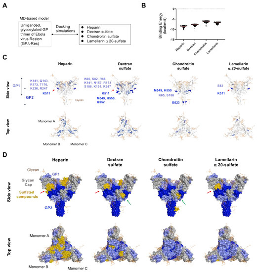 Characterization of possible binding modes of sulfated compounds on the Reston Ebola virus glycoprotein. Docking simulations of sulfated compounds to the Ebola virus GPΔ-Res structure at 100 ns of MD simulation were performed using the Dock application in MOE. (A) Overview of docking simulations. (B) Distribution of binding energies of the top 100 binding poses. Binding free energies were calculated for each docking pose using the Dock tool in MOE. Red lines indicate mean values. (C) Distribution of glycoprotein residues for binding with sulfated compounds. Amino acid residues interacting noncovalently with sulfated compounds were identified with the 100 docking poses using the Contact Analysis tool in MOE. Residues that were involved in the noncovalent interactions more than 10 times in the 100 docking poses are highlighted in different colors. Light blue and blue spheres indicate residues in the GP1 and GP2 subunits, respectively. (D) Docking poses of sulfated compounds. Dark yellow spheres indicate atoms of compounds noncovalently bound with the glycoprotein residues in (C). Red arrows indicate a binding site common to heparin, dextran sulfate, and lamellarin α 20-sulfate. Green arrows indicate a binding site common to dextran sulfate and chondroitin sulfate, which was found to be identical to a binding site of the approved anti-Ebola virus drugs [47,98].