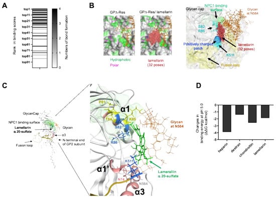 To gain insight into the molecular mechanisms underlying antiviral actions, we further characterized the sites and chemical features of the molecular interactions between lamellarin α 20-sulfate and Ebola virus GPΔ-Res. The principal binding site predicted for lamellarin α 20-sulfate (Figure 8D, lamellarin α 20-sulfate) accommodated 32 docking poses that exhibited the best and majority of the higher-level binding affinities among the 100 poses (Figure 9A). This binding site was located near the glycan at N564 in the Reston Ebola virus glycoprotein (N563 for the Zaire Ebola virus glycoprotein [47]) and constituted a hydrophobic cavity with patches of hydrophilic residues, such as S82, R86, and K511 (Figure 9B). Thus, both electrostatic and hydrophobic interactions could play key roles in the binding that takes place at this site. Although the principal binding sites of chondroitin sulfate were different from those for lamellarin α 20-sulfate, the types of interactions were identical (Figure S2).
