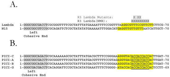 As in the case of cosB-λ, the cosBs of other λ-like phages, such as φ80, 21, and Gifsy-1, have three R sequences and an IHF site. The order of subsites is R3-I1-R2-R1, where R2 is oriented opposite to R3 and R1. An exception is phage N15, the cosB of which consists of a single R sequence, R3-N15, analogous in location to R3-λ [19,20] (Figure 1C and Figure 2).