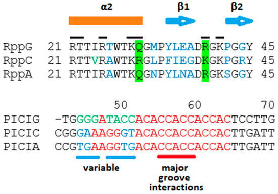Possible recognition specificity of PICI’s R3 and their correspondent Rpps. (Top) Alignment of studied Rpps (RppB has an identical residue sequence to RppA in the shown region). The bar on top shows the extent of the α2-helix and the arrows those of the β-sheets. The lines on top of the one-letter code show the residues that have been proposed to interact with bases in R3. Of those residues, the ones highlighted in green differ between RppC and the other Rpps. Therefore, they may provide R3-binding specificity. The residues in blue show differences in other regions, and some of them may provide specificity for RppG and RppA to discriminate from PICIG- and PICIA-R3s. Notice that most of the divergence is in the α2-helix–β1-sheet link, especially in the β1-sheet itself and in two residues of the β2-sheet. (Bottom) Alignment of the correspondent R3 regions of cosB PICIs. Red bases show identity, blue ones show differences between A- and C-R3s, and green bases show difference between PICIG-R3 and the other two Rs. Notice the striking identity in the 3′ part and the deviation in the 5′ portion. The sequence that varies between the PICIs R3 are underlined in blue. The base pairs that are supposed to interact with Rpps residues in the major groove are underlined in red.
