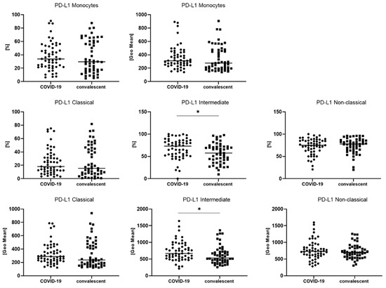 The differences between COVID-19 and convalescent patients for geometric mean expression of PD-L1 on classical, intermediate and non-classical monocytes. Graphs show the median values (−). Significant differences in the cell proportion between COVID-19 and convalescent patients in the Mann–Whitney U test presented as * (p < 0.05).