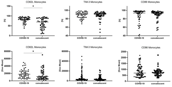 We analyzed the median proportion of monocytes with TIM-3, CD62L or CD86 expression and the GeoMean intensity of these markers on monocytes. A significantly higher median proportion of monocytes with CD62L expression (83.0 vs. 69.6% p < 0.05) was found. We also noticed a higher GeoMean of CD62L on monocytes in COVID-19 patients than convalescent patients (17,970 vs. 11,362, p < 0.05) (Table 4, Figure 5).