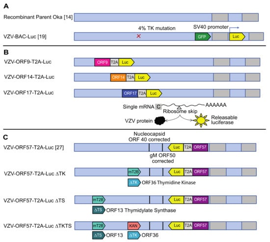 Constructs for VZV reporter viruses. The diagram depicts the presence of the recombinant sequences used to alter pOka [14] with BAC recombineering, as detailed in the text. Viruses shown in (A) include parent Oka and VZV-BAC-Luc, derived from the BAC-Zhu pOka system [14,19]. VZV-BAC-Luc was generated from pOka (passage 9), as previously described [19], and included a small population of TK-virus, which arose through unknown mechanisms. (B)—upper section: viruses derived from an uncorrected BAC system, as detailed by the Osterreider group, which include VZV-ORF9-T2A-Luc; VZV-ORF14-T2A-Luc; and VZV-ORF17-T2A-Luc. (B)—lower section: diagram of the viral protein and luciferase expression mediated by the T2A ribosome skipping motif, which is used to generate two proteins from one mRNA. (C) VZV-ORF57-T2A-Luc [27], VZV-ORF57-∆TK, VZV-ORF57-∆TS, and VZV-ORF57-∆TK∆TS were generated in a BAC with corrected spurious mutations identified in ORF40 and ORF50 (Tischer VZV-BAC [18]), as detailed in the text. In VZV-ORF57-Luc, ORF13 (TS), ORF36 (TK), or both, were deleted through site-directed recombination events to replace the partial (ORF36) or entire (ORF13) ORFs with either the mturq2blue (mT2B) fluorescent reporter gene or a kanamycin resistance cassette. The colors used for each virus are carried through the rest of the figures for continuity.
