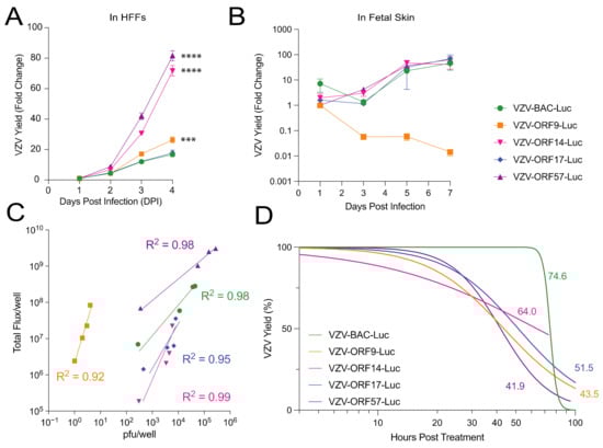 Evaluation of VZV-BAC-Luc and VZV-ORFx-Luc growth kinetics and bioluminescence in tissue culture and human fetal skin. Cells and skin were infected with cell-free or cell-associated virus, respectively, and grown at 37 °C. Cell culture experiments (A,C,D) were performed in HFFs, while skin organ culture (B) was performed in fetal skin. (A,B) VZV yield was measured by bioluminescence imaging and calculated as the fold change from the average Total Flux (photons/sec/cm2/steradian), divided by the lowest Total Flux value (DPI 1 for cells, or DPI 1-3 for SOC). (C) Correlation coefficients of luciferase and virus plaque number were determined for each VZV reporter virus on the basis of the relationship of pfu/well to average Total Flux per well. (D) HFFs and VZV were co-cultured for approximately 40 h prior to foscarnet treatment (1 mM) to block viral DNA replication. Values next to each curve represent the time (in h) for bioluminescence to decrease by 50% after treatment started and are shown in the corresponding color for each virus (individual points omitted for clarity of graph). Each point represents the mean ± SEM. Statistical analyses included one-way ANOVA with Dunnett’s post hoc test (A,B, *** p < 0.001; **** p < 0.0001). Nonlinear regression analysis with (C) log–log line or (D) dose response—inhibition was used for best-fit lines. n = 3 biological replicates for cell-based assays; n = 6 biological replicates for skin organ culture.