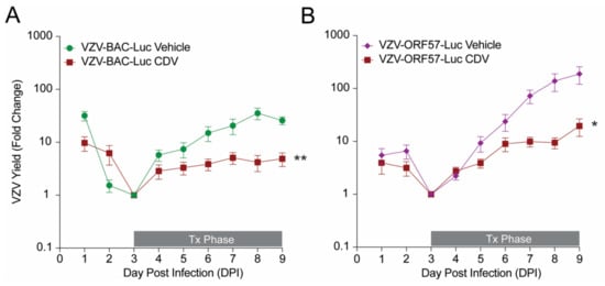 Evaluation of VZV-BAC-Luc and VZV-ORF57-Luc growth kinetics and responses to antiviral treatment in a SCIDhu mouse model. SCID beige mice were implanted with a single subcutaneous xenograft of fetal human skin. Xenografts were inoculated 3–4 weeks later with (A) VZV-BAC-Luc or (B) VZV-ORF57-Luc by intra-xenograft injection (1 × 104–105 pfu/mL; 60 µL injection; grown in HFFs). Mice were treated with vehicle (water) or 10 mg/kg/day cidofovir (CDV) by intraperitoneal injection from DPI 3 to 9 (Tx Phase). VZV yield was measured daily by bioluminescence imaging and the fold change was calculated as Total Flux each day divided by the lowest Total Flux value per mouse (usually taken on DPI 2 or 3). Virus growth kinetics were evaluated for statistical significance on DPI 9. Symbols represent mean ± SEM. Student’s t-test; asterisks indicate significance between vehicle and cidofovir groups (* p < 0.05; ** p < 0.01). n = 6–10 mice per group.