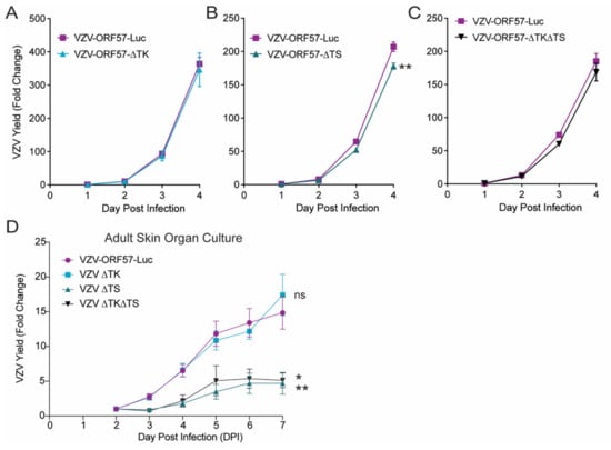 VZV TK is dispensable while VZV TS is required for optimal growth in cells and is critical for human skin organ culture. Cell-free VZV was added to ARPE-19 monolayers at 37 °C (A–C; 1:50 ratio) or introduced to adult human skin (D; 1 × 104–105 pfu/mL; 30 µL inoculum) by scarification, placed on NetWells, and incubated at 35 °C. Virus spread was monitored daily by bioluminescence imaging. Cell cultures were infected with up to 500 pfu/well. Skin was infected with 300–3000 pfu/piece of skin, depending on the viral titer that could be attained in ARPE-19 cells. VZV-ORF57-Luc was grown independently in ARPE-19 for each assay in (A–C), and directly compared to (A) VZV-ORF57-∆TK, (B) VZV-ORF57-∆TS, or (C) VZV-ORF57-∆TK∆TS under the same conditions. (D) Growth kinetics of ∆TK, ∆TS, and ∆TK∆TS in adult human skin explants were evaluated for significance compared to parental VZV-ORF57-Luc on DPI 7. VZV yield was calculated as the average Total Flux each day divided by the Total Flux on (A–C) DPI 1 or (D) DPI 2. Each point and line represent the mean ± SEM. (A–C) Student’s t-test or (D) one-way ANOVA with Dunnett’s post hoc test; * p < 0.05; ** p < 0.01, ns = not significant. n = 6 biological replicates.
