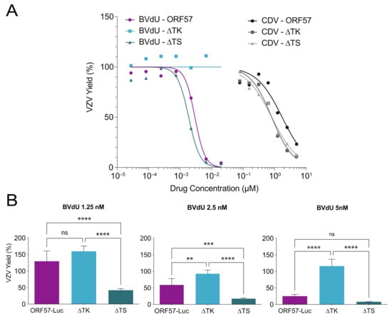 Loss of VZV TK and TS affect virus sensitivity to select antivirals in cell culture. Cell-free VZV was added to ARPE-19 monolayers at 37 °C and compounds were added at 2 h postinoculation (HPI). Antiviral compounds remained in culture medium until VZV yield was measured on DPI 3. Infected cells were treated with cidofovir (CDV) and brivudine (BVdU) (A) in a range of concentrations, or (B) at specific concentrations of BVdU (1.25, 2.5, or 5 nM). VZV yield was calculated as the average Total Flux of treated wells divided by the average Total Flux of untreated wells. (A) Each point represents the mean Total Flux with the best fit line. (B) Each bar represents the mean + SD. Asterisks indicate significance between VZV viruses for each treatment condition (ns = no significance; ** p < 0.01; *** p < 0.001; **** p < 0.0001). p < 0.05; one-way ANOVA; Tukey post hoc test. n = 3 (A) to 6 (B) biological replicates.