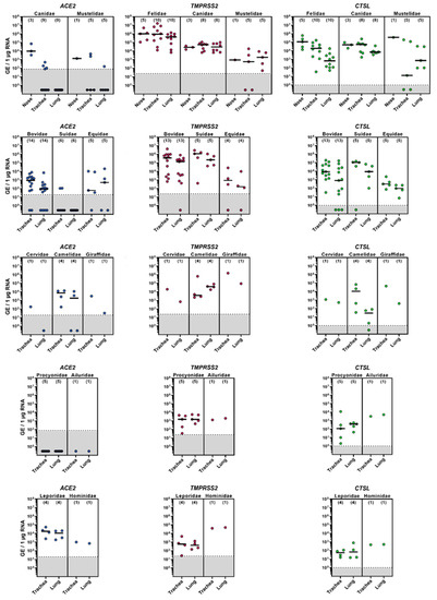 mRNA expression of ACE2, TMPRSS2 and CTSL in the respiratory tract of domestic and wild animals. RNA was isolated from the nasal mucosa, trachea and lungs and subjected to RT-PCR, followed by quantitative PCR, targeting ACE2, TMPRSS2 or CTSL. Dilution series of expression plasmids containing the respective targets were used to generate standard curves to calculate the amounts of genomic equivalence (GE) based on the ct values. The graphs show average (median, indicated by black lines) data from individual animals (n is indicated by numbers in brackets). For each individual sample (circle) five technical replicates were measured, and the average (mean) is shown. Samples within the gray shaded area were below the threshold (determined separately for each primer pair).