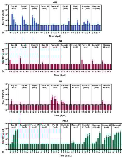 Viral replication of SARS-CoV-2 in primary respiratory cell cultures: (a) Nasal mucosa explants (NME), (b) air–liquid interface (ALI) cultures generated from tracheal epithelial cells and (c) precision-cut lung slices (PCLS) were infected with SARS-CoV-2. The supernatants were collected at the indicated time points (days post infection, d p.i.), and viral titers were determined by titration on Vero E6 cells. Viral titers are given as plaque-forming units (PFU)/mL. The graphs show means and standard deviation of n replicates. The dashed lines indicate the limit of detection (=11.76 PFU/mL).
