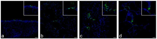 Detection of the SARS-CoV-2 nucleoprotein (NP) in primary respiratory cell cultures derived from a dog, hamster and human by immunofluorescence. In paraffin-fixed tissue sections of SARS-CoV-2 infected primary respiratory tract cell cultures, immunofluorescence staining of SARS-CoV-2 NP (green) and nuclei (blue) was performed. (a) Respiratory epithelium and submucosal glands of canine nasal mucosa explants. (b) Canine, (c) hamster and (d) human precision-cut lung slices with alveolar and bronchial epithelium as well as connective tissue (100× magnification). Inset shows positive signal at higher magnification (400× magnification). Scale bar represents 50 µM.