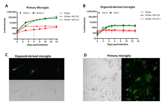 Primary microglia and organoid-derived microglia support productive HIV infection. (A) Organoid-derived microglia and (B) primary microglia were infected with HIVbal and treated with MVC (200 nM) pre-infection (D-1) and 3 days post-infection (D3). Supernatant was collected at each timepoint and analyzed for luciferase activity. The means ± standard errors of the means are shown. Representative pictures of (C) organoid-derived microglia (OH1.5) and (D) primary microglia infected with HIVbalGFP, taken in culture after 9 (oMG) and 11 days (pMG) of infection. All pictures were taken with a magnification of 20×.